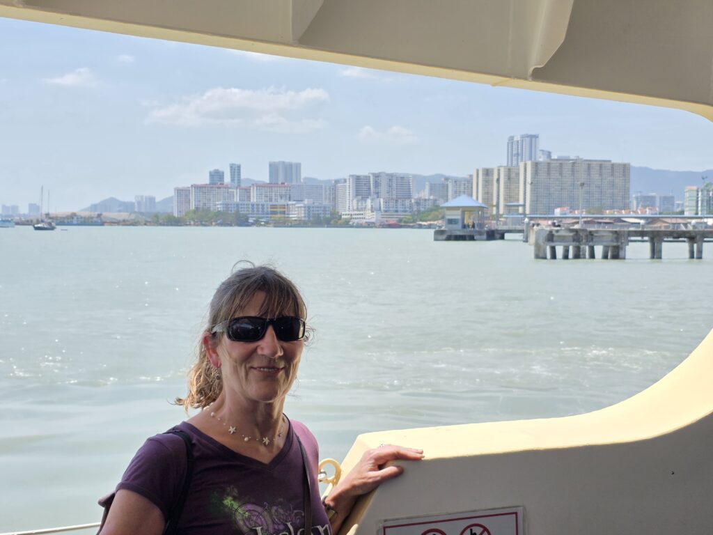 The heat was a solid wall when we got off the bus in Butterworth, a town on the mainland but with views of Penang island, obviously we didn’t put any laptops into the bus hold this time.  The bus station was very conveniently connected to the ferry terminal to get a ferry to George Town, the main town on the island of Penang. Admittance to the ferry terminal was by swiping bank card or phone wallet (no cash accepted) at a cost of about €0.40 for the crossing. There was no ticket issued, or no checking of tickets…..if you got in, it was presumed that you had paid.