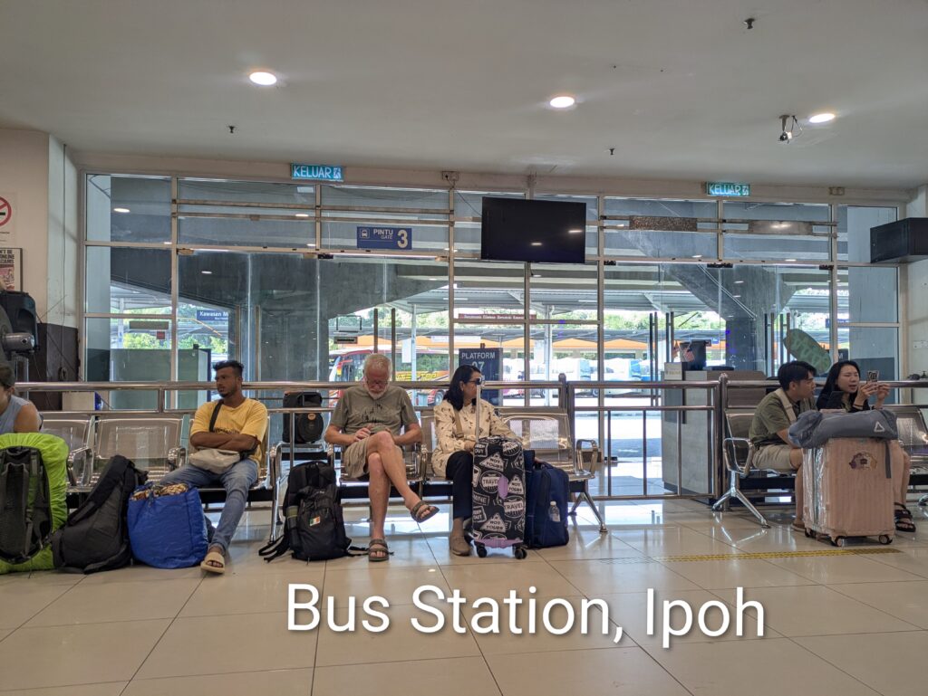 The bus station in Lumut was in darkness with shuttered ticket offices and a few potential passengers hanging around and checking their watches. We were sweating in the muggy heat but at least the rain had stopped.  One bus had its engine running but the driver was nowhere to be seen, all the other buses were silent. We hoped to get the 7.20am bus to be sure of making a connecting bus without too much hanging around, another bus was scheduled to leave for Ipoh at 7.30am but it took much longer (at least according to the timetables.) A driver appeared just before 7,30am and when I asked him whether his bus was the 7.20 or 7.30am, he said that it was both. Anyway the traffic was light and we arrived in Ipoh ahead of schedule, with plenty of time to have a breakfast of fried noodles and fried eggs before getting another bus to the Cameron Highlands.