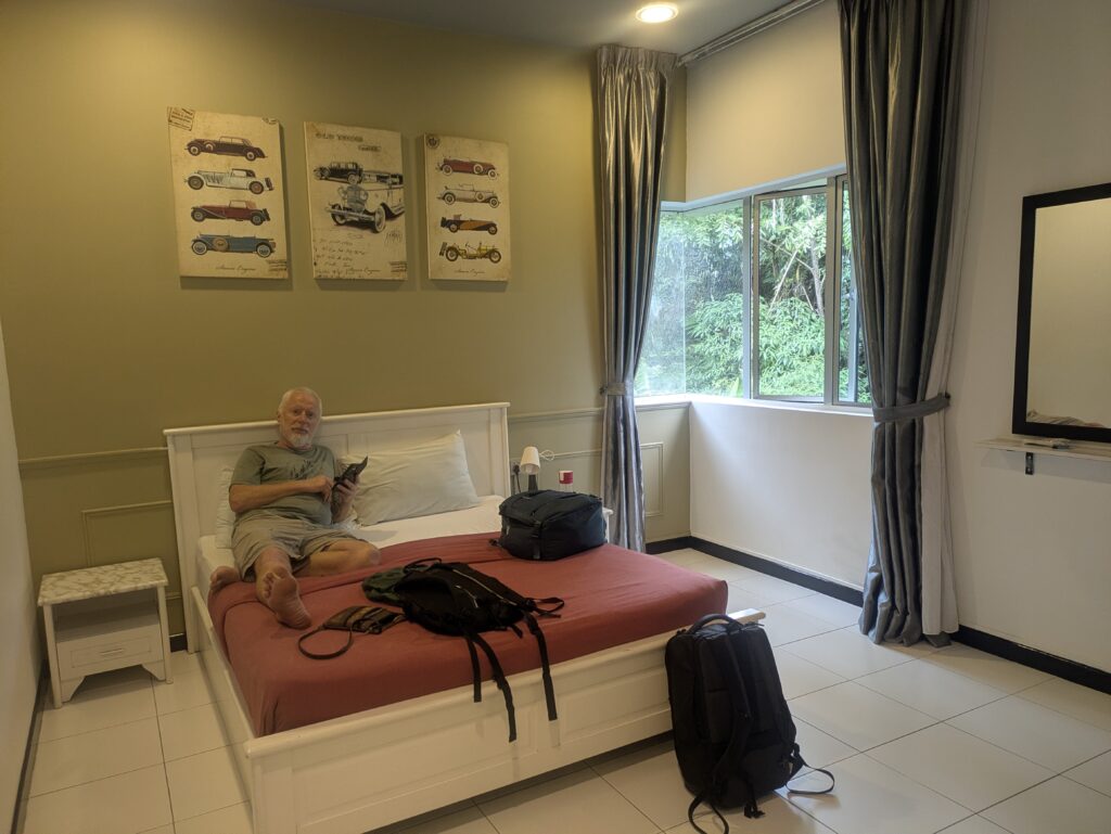 When my phone alarm went off at 5.45am, we were already awake, woken by the torrential rain which was loud enough to drown out the sound of the bedroom air-com in our guesthouse on Pangkor Island.  Sometimes the ceiling fan was enough for sleep but more often, we turned on the aircon at some stage during the night, when the nighttime temperatures hovered around 27C.  In the pre-dawn darkness, the rain was literally like turning a bucket upside down. We finished our packing, hoping it would ease but it only intensified. Caoimhin ran around the corner to get one of the island pink taxis, which then drove to the front door of our guesthouse to collect me and our bags before driving us to the small port to get the ferry. Caoimhin was the proverbial drowned rat.
