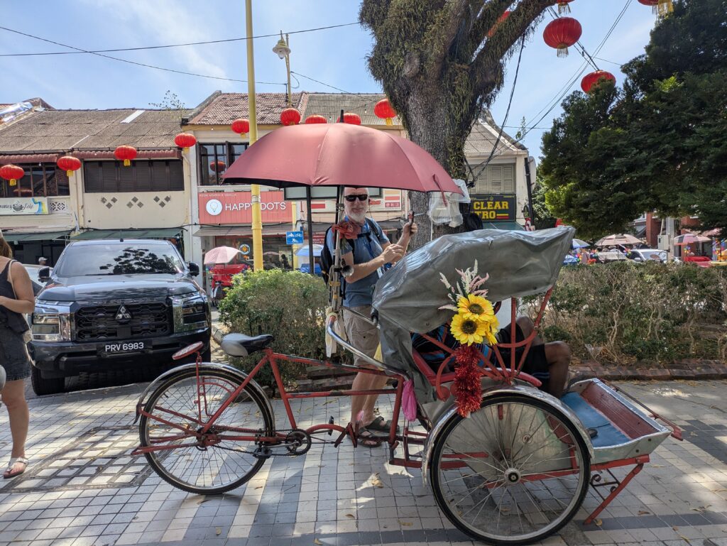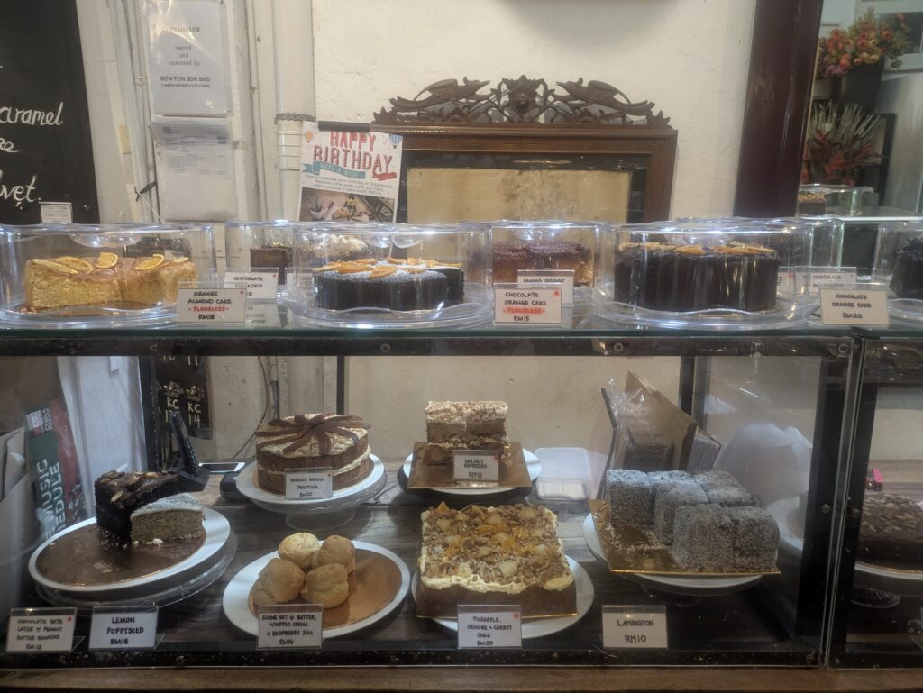Penang food was delicious but the biggest surprise was the pastry shops – we ate the crumbliest almond croissants that I had ever eaten. There was a cake shop here with the unlikely name of China House with the largest selection of cakes and dessert …every sort of cheesecake, chocolate and fruit cake that you could imagine. Yummy but with prices for Western wallets – tea and a slice of cake here cost us three times the price of our lunch of fried rice and beans and vegetables.