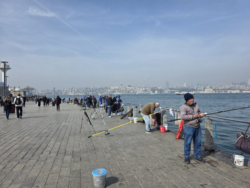 There were many tourist cruises on the Bosphorus but it was just as enjoyable to take a local ferry and view the city from the water. Seagulls twirled overhead, arguing over the food scraps that passengers threw to them. Swarms of small translucent jellyfish floated on the water surface while on the river banks rows of fishermen, almost elbow to elbow, cast their rods into the blue waters.
