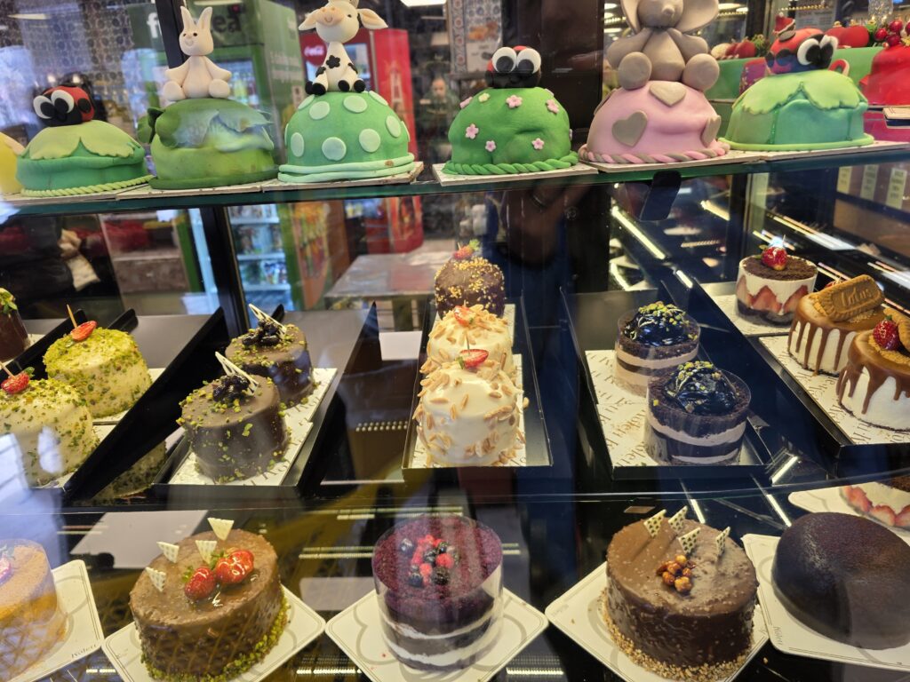 Our guide, Haktan, also told us the Turkish recipe for happiness. It is based on the availability of three things, tea (cay) which is drunk black and sweet, while sitting on soft, coloured cushions, tobacco which is one of the few things that has not increased in price, according to Haktan and finally the presence of cats because Turks are animal lovers. Cats were everywhere in Istanbul and I mean everywhere –on the restaurant tables, the gift shops and even the toilets – and have been associated with the city since antiquity. Turks were not big drinkers so alcohol was expensive and not widely available so we drank tea instead. But it was a fantastic place to indulge a sweet tooth – trays of all types of baklava, dripping in honey, chocolate bombs with chopped pistachio and mounds of fragrant Turkish Delight, dusted with sugar. No wonder Turkey has a reputation for dentistry.