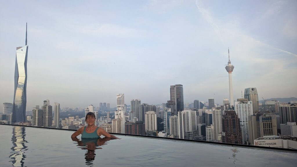 We stayed at the Axon Residences building in the Bukit Bintang area, which was close to transport options, shopping malls, night food markets and lots of restaurants. The hotel was incredible, consisting of two tall buildings, linked on the 37th floor  by a bridge of glass and concrete called the  Sky bridge. Craning our necks to peer up at the bridge from the street, the structure seemed to float, an impressive feat of engineering.  Walking through it gave jaw dropping views of the surrounding skyscrapers including the iconic 88-story Petronas Twin Towers, the  symbol of Malaysia. The infinity pool on the roof merged into the surrounding buildings in a way that made us gasp when we first saw it. There were fitness rooms, a high-rise garden and even a running track on the 10th floor…..although only the very dedicated person would run in the sticky heat. The downside of staying in a tall, busy building was the waiting for the lifts, which were quite slow, usually jam-packed and nearly always seemed to be going in the wrong direction.