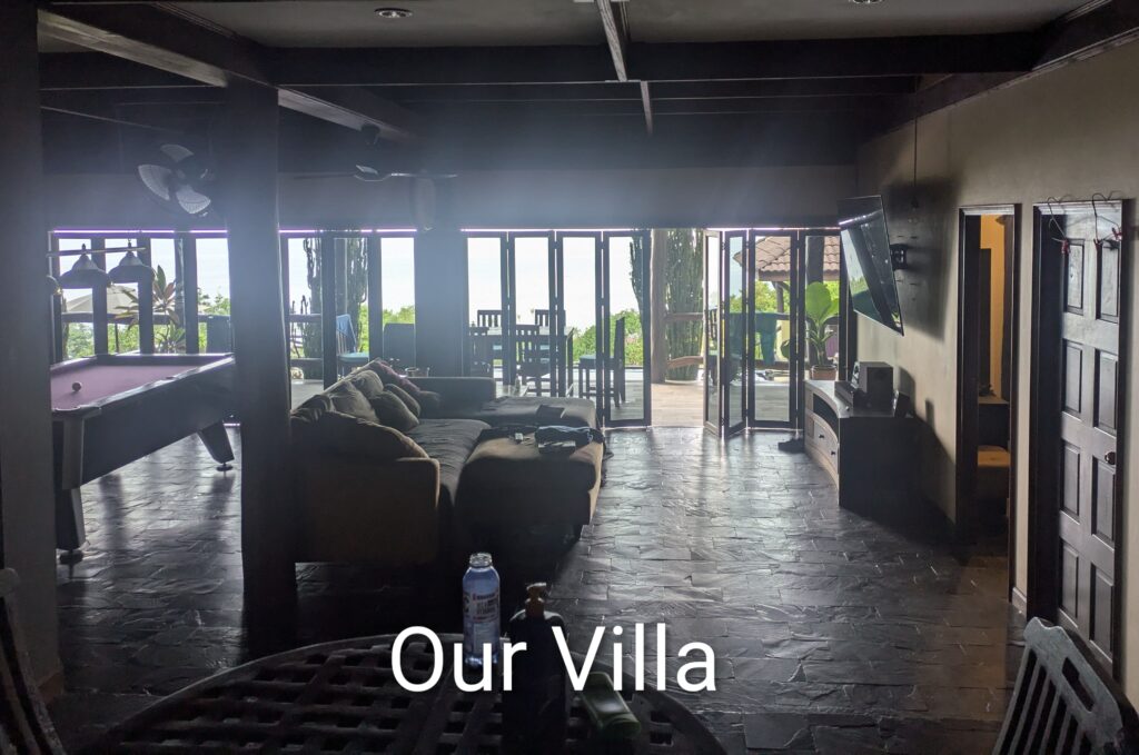 Caoimhin and I were the first to arrive at the villa in the hills overlooking Haad Yao Bay, about a twenty-five minute songthaew ride away from our basic accommodation. The villa was anything but basic, it was stunning, decorated in dark wood with a wall of glass doors which folded back to showcase the fantastic sea views. There was a large living area with a pool table, several outside dining spaces and a lovely pool with sun loungers. However, the view came at a price – the hill to reach it was a nearly vertical 300 metres climb……which most taxis refused to ascend.